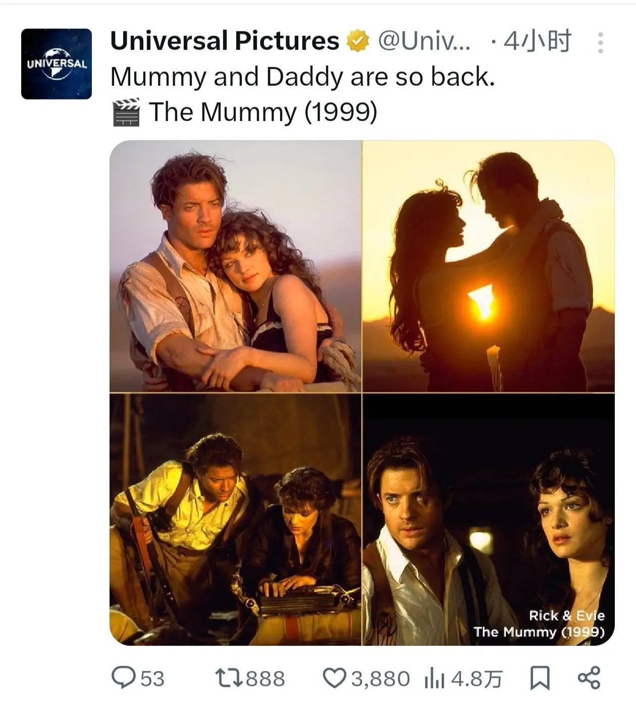 魔幻冒险电影《木乃伊》细则将拍第四部,布兰登·费舍、蕾切尔·薇兹转头主演,定档2028年5月19日北好意思上映。