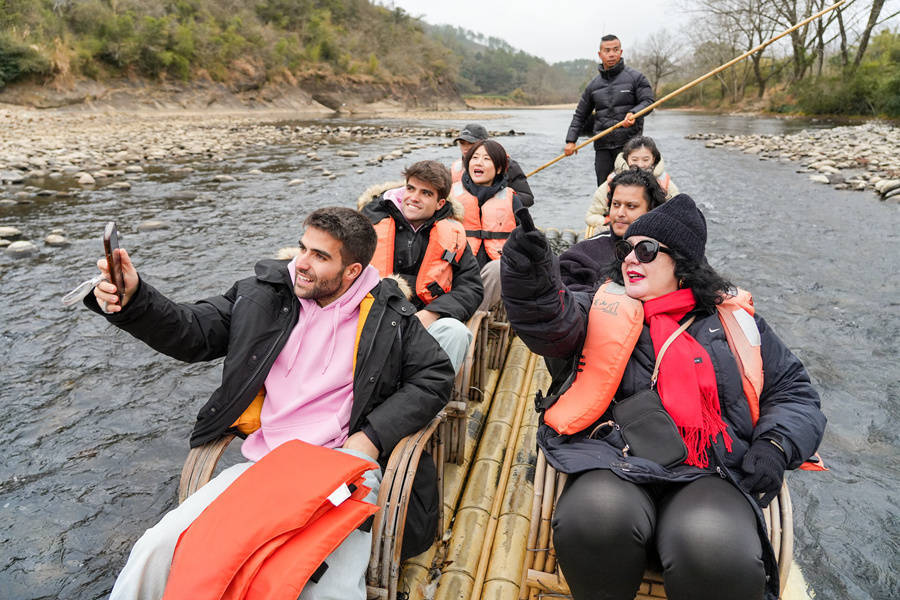 欧洲旅游媒体与博主们乘坐竹筏,用镜头纪录武夷山水之好意思。