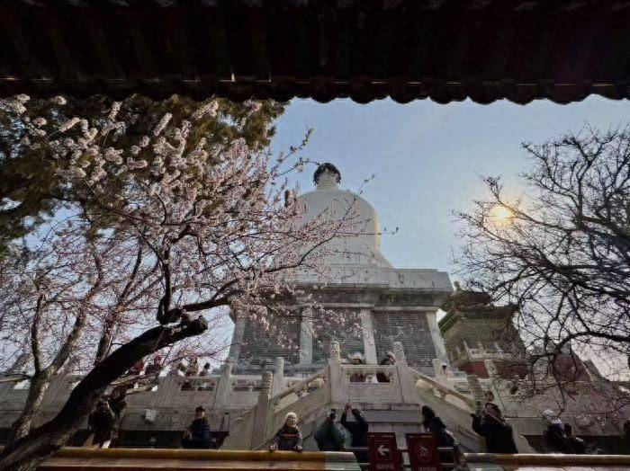 粉白花瓣随风轻颤,将古朴的汉白玉雕栏、红墙灰瓦与巍峨的白塔晕染出温顺春意。
