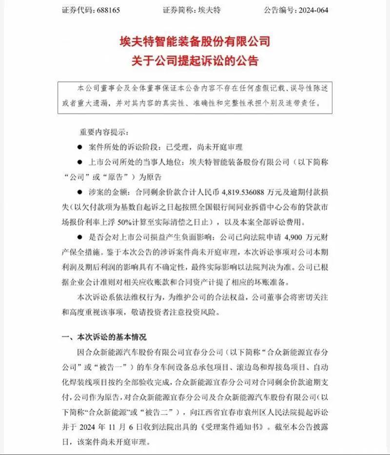 近期,哪吒汽车的母公司合众新动力还碰到供应商追债,新添了一宗讼事。11月8日晚间,智能装备上市公司埃夫特发布一则公告,称因合众新动力宜春分公司(简称“宜春合众”)拖欠公约款约4819.54万元已向法院告状宜春合众,条件支付拖欠的公约款并抵偿过期付款损失。同期,埃夫特还将宜春合众母公司合众新动力列为第二被告,条件其对上述欠款承担补充璧还职守。