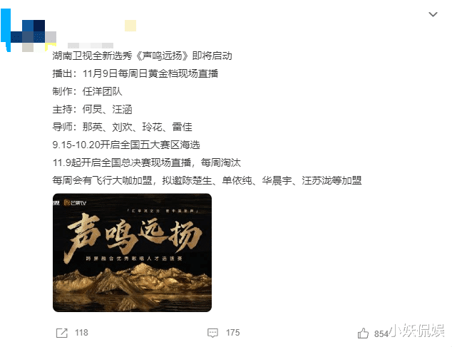 还节目将于9月中旬至10月中旬开启寰球五大赛区海选,11月9日开动寰球总决赛,每周会进行淘汰赛,该节蓄意主握东说念主则是湖南卫视的台柱子何炅和汪涵。