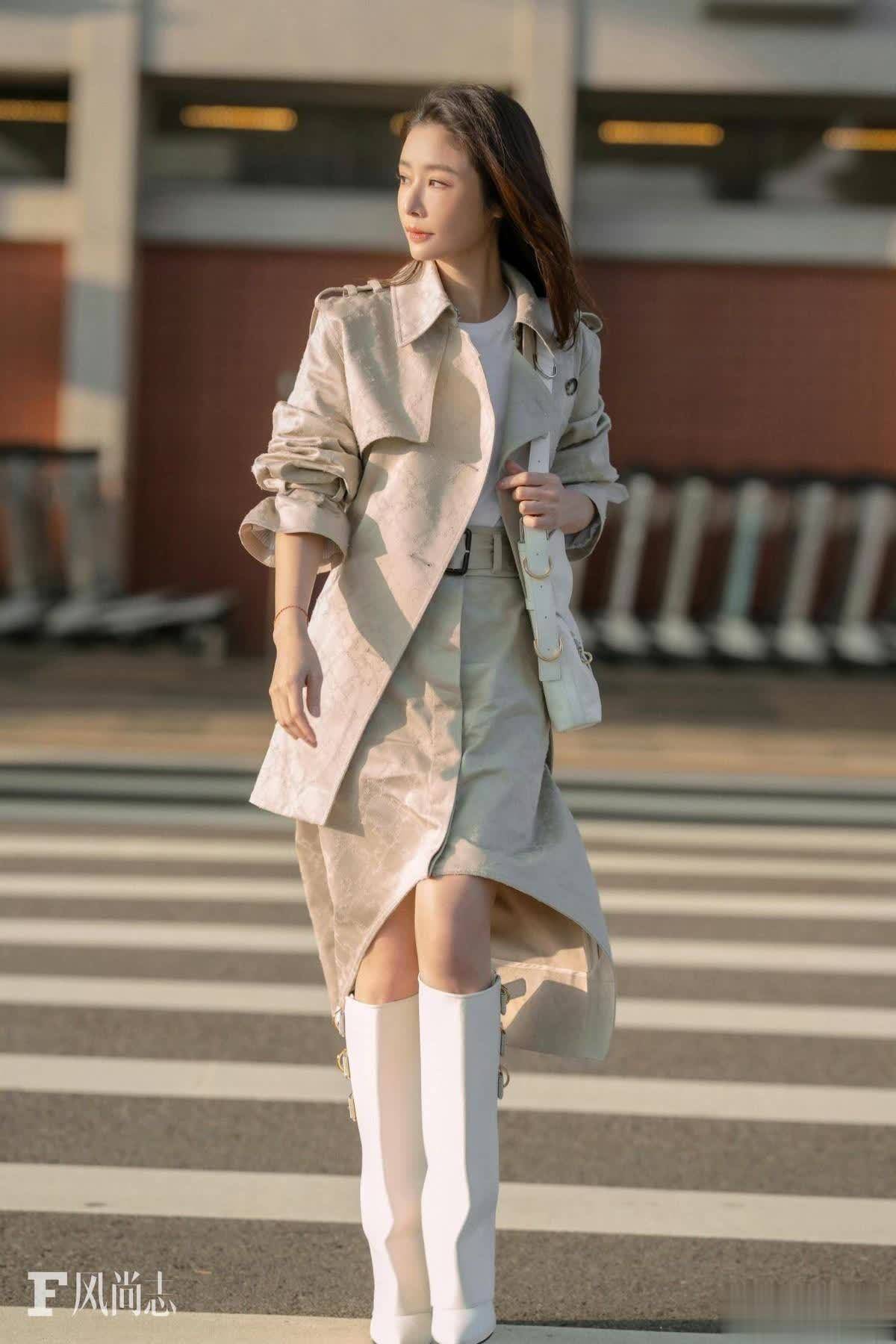 在这张像片中,林心如则展现出了一种飒爽又端淑的格调。上身是一件卡其色的风衣,经典的形状永不外时,腰带的接头好像很好地勾画出腰线,幸免了风衣带来的肥壮感。内搭浅薄的白色T恤,起到了提亮和检朴打底的作用。