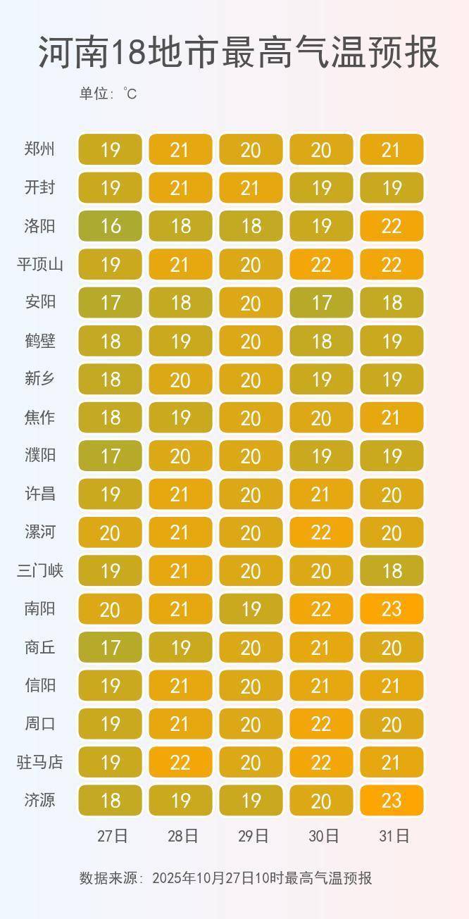 瞻望本周河南气温举座矜重,在阳光的加合手下,大部地区白昼的最高气温基本皆在20℃傍边踟蹰,午后多了几分暖意。而在夜间,由于受晴空放射降温影响,最低气温仅10℃高下,旦夕外出依旧是需要羽绒服护体。